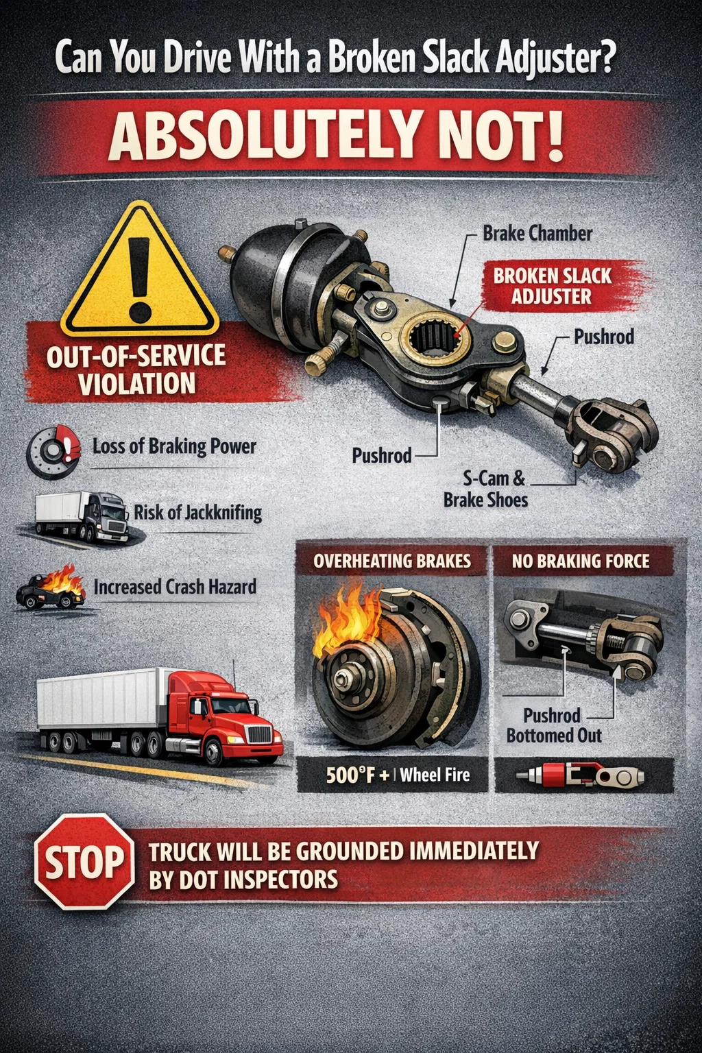 Die kurze Antwort lautet absolut nicht. Mit einem kaputten, defekten oder falsch eingestellten Gestängesteller dürfen Sie kein Nutzfahrzeug legal oder sicher fahren. In den Augen des Verkehrsministeriums (DOT) und der Sicherheitsinspektoren ein Bruch Gestängesteller handelt es sich um einen „Außerbetriebnahme“-Verstoß. Wenn Sie beim Führen eines Fahrzeugs mit diesem Defekt erwischt werden, wird Ihr LKW sofort am Inspektionsort blockiert.