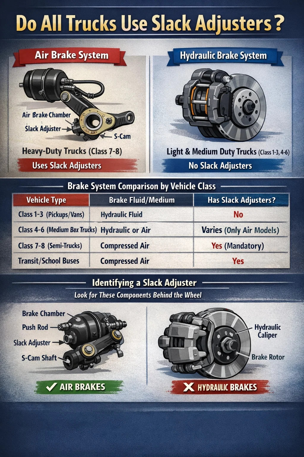 Interessanterweise sogar modern Druckluft-Scheibenbremsen (die bei Lastkraftwagen der Klasse 8 immer beliebter werden) verfügen über einen internen Mechanismus, der die Funktion „Durchhangseinstellung“ ausführt, ihnen fehlt jedoch der traditionelle externe „Arm“, den Fahrer bei einer CDL-Inspektion vor der Fahrt zu sehen und zu überprüfen gewohnt sind.