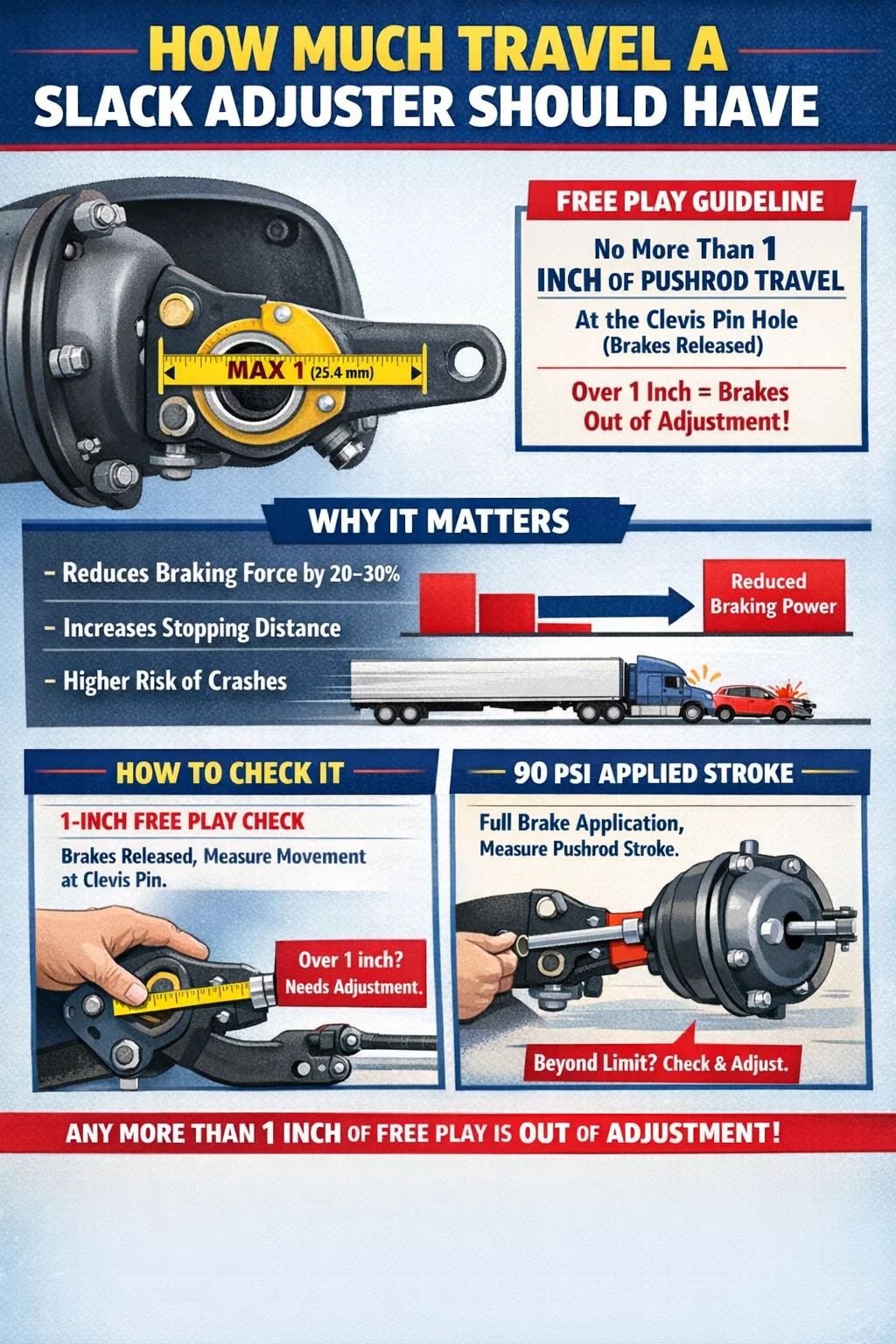 Wenn der Stößelhub während einer Bremsbetätigung den gesetzlichen Grenzwert überschreitet, gilt das Fahrzeug als außer Betrieb. Der genaue Grenzwert hängt jedoch von der Art und Größe der Bremskammer ab 1 Zoll freies Spiel am Gabelkopfbolzen ist das weithin akzeptierte Feldmaß Das zeigt die richtige Einstellung an. Jeder Gestängesteller, der zu diesem Zeitpunkt einen Spielweg von mehr als 1 Zoll aufweist, muss sofort überprüft werden.