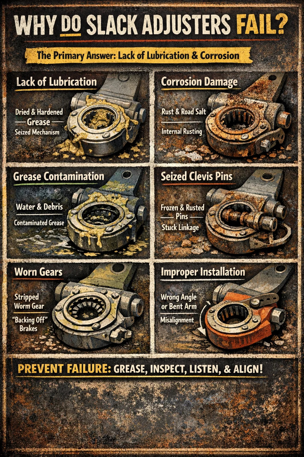 In den allermeisten Fällen Gestängesteller fallen aufgrund mangelnder Routineschmierung und umgebungsbedingter Korrosion aus. Da sich diese Komponenten an der Unterseite des Fahrgestells befinden, werden sie ständig mit Straßenschmutz, Wasser und ätzenden Enteisungsmitteln bombardiert. Wenn das interne Fett austrocknet oder verunreinigt wird, blockiert oder nutzt sich der empfindliche interne Ratschenmechanismus ab, sodass die Komponente das Bremsbackenspiel nicht automatisch anpassen kann. Sekundäre Ursachen sind interner mechanischer Verschleiß der Zahnräder und eine unsachgemäße Installation des Querlenkers.